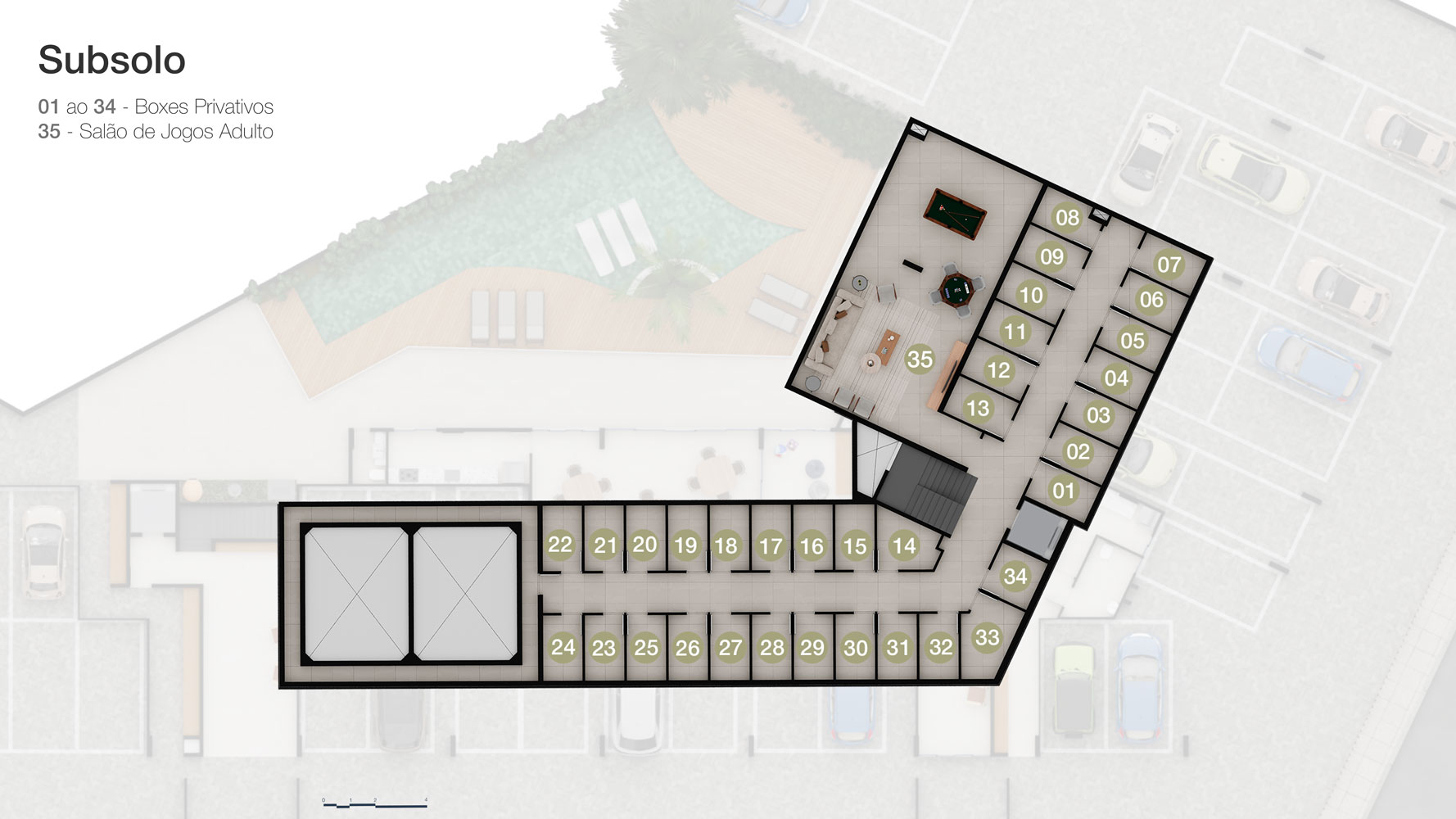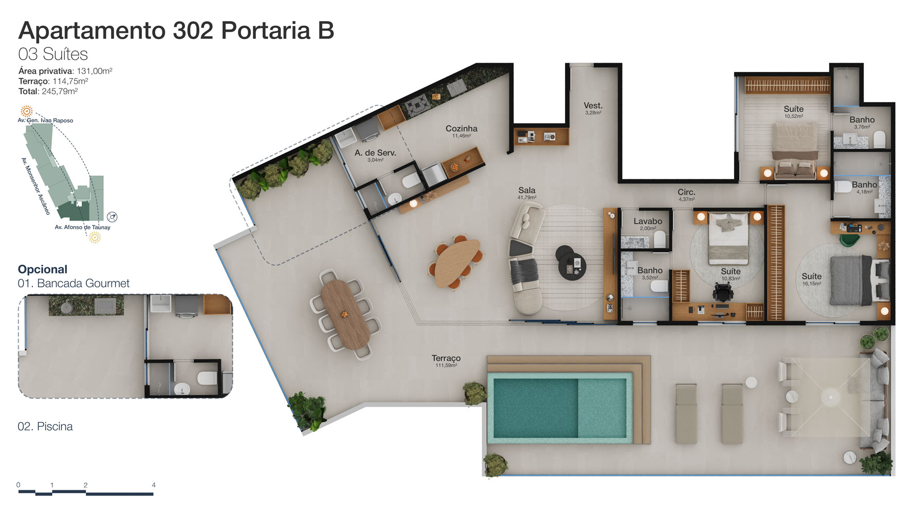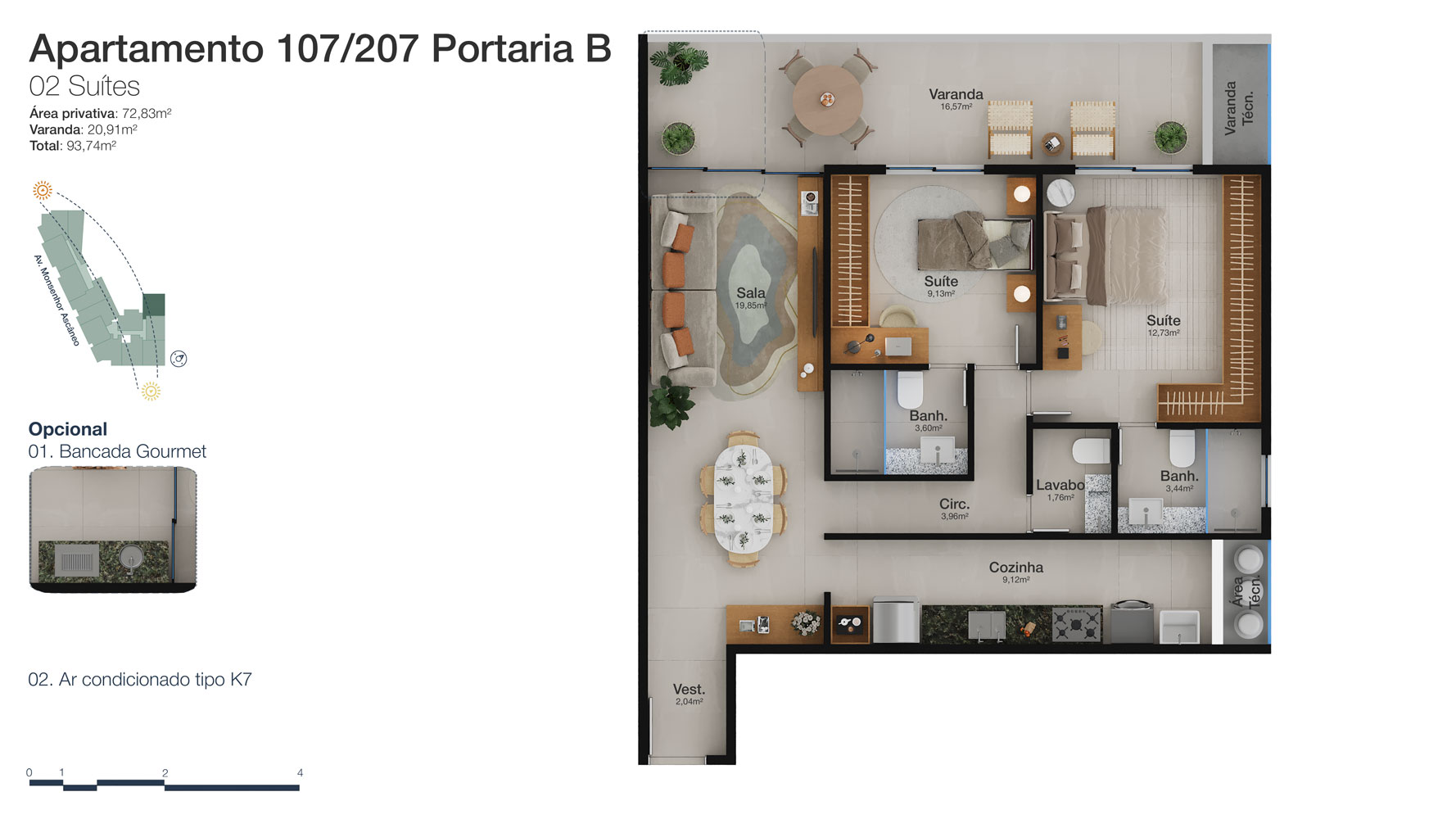 São 34 unidades exclusivas, entre apartamentos e coberturas, com metragens que variam de 87m² a 245m² e plantas de 2 a 3 suítes.