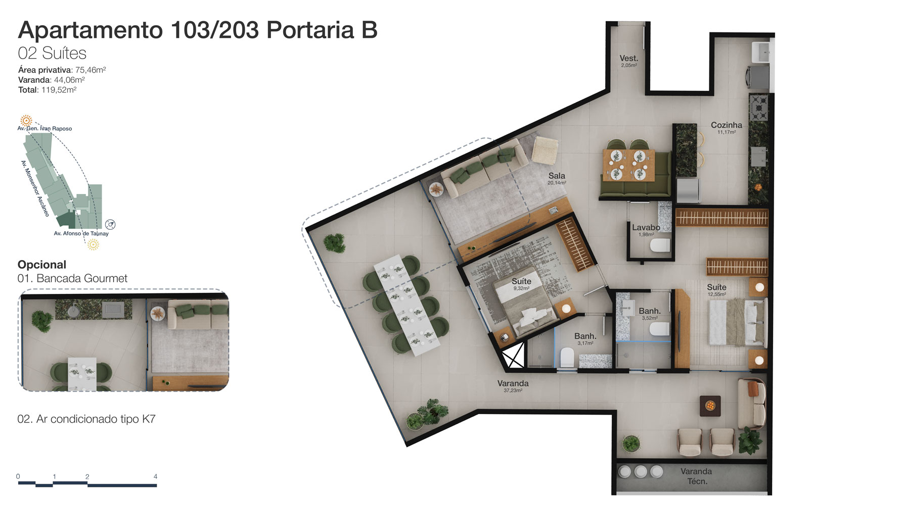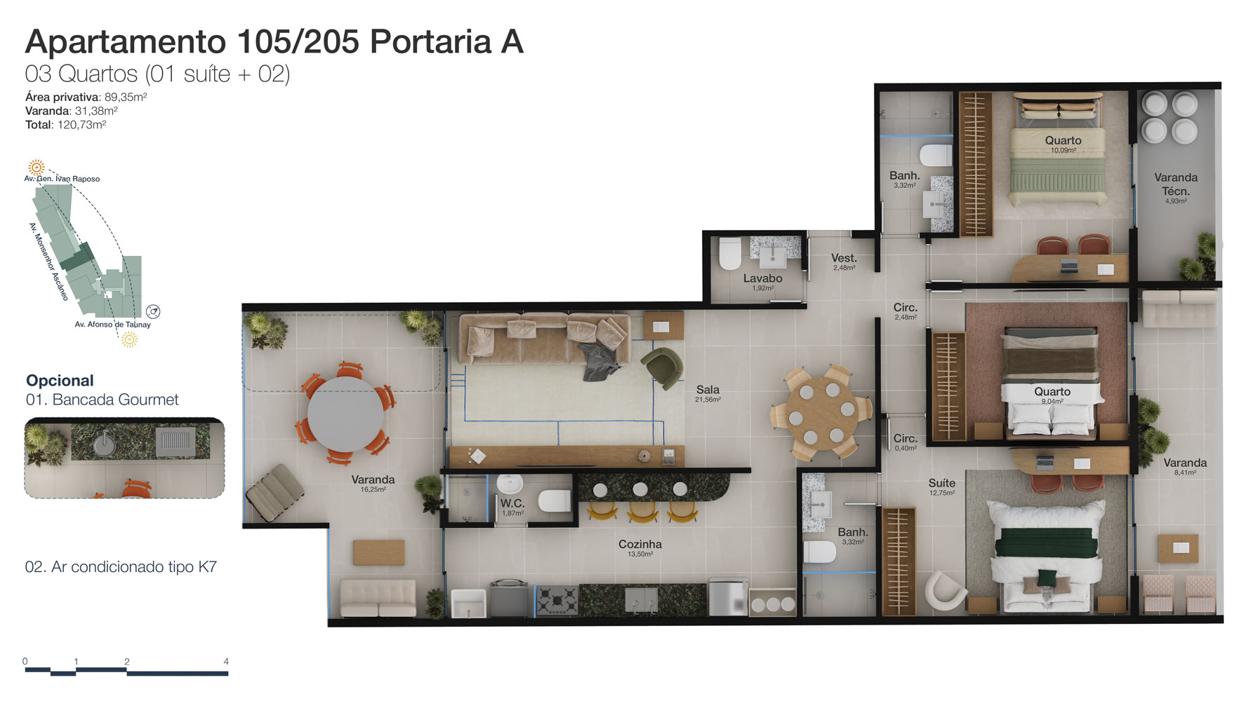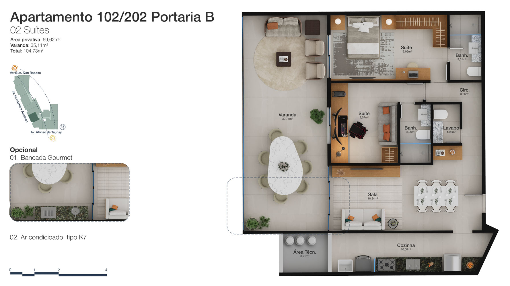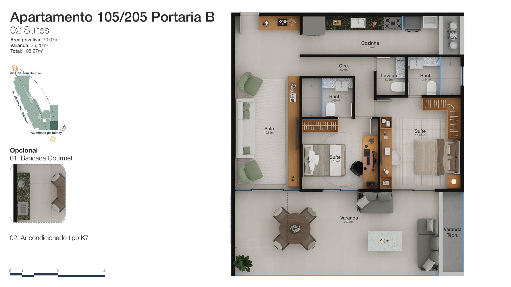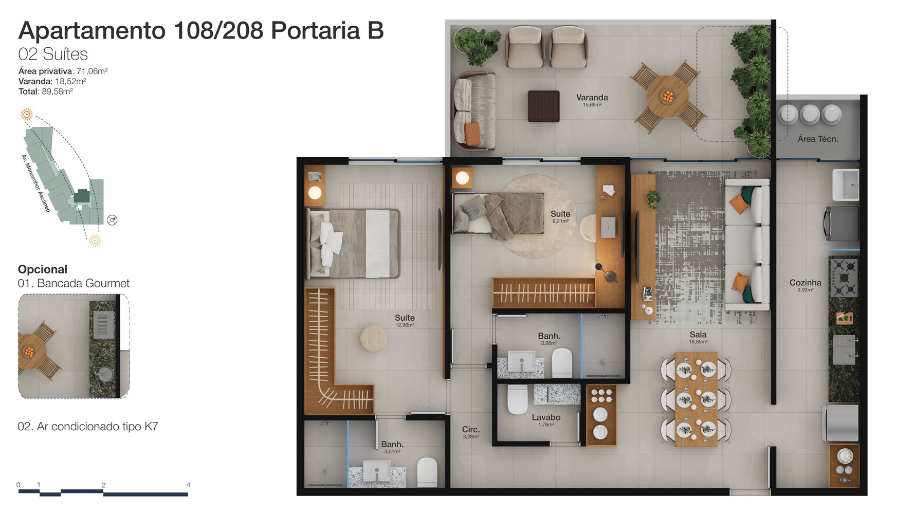 Tipologia: Apartamentos de 2 a 3 suítes e coberturas lineares de 2 e 3 suítes
