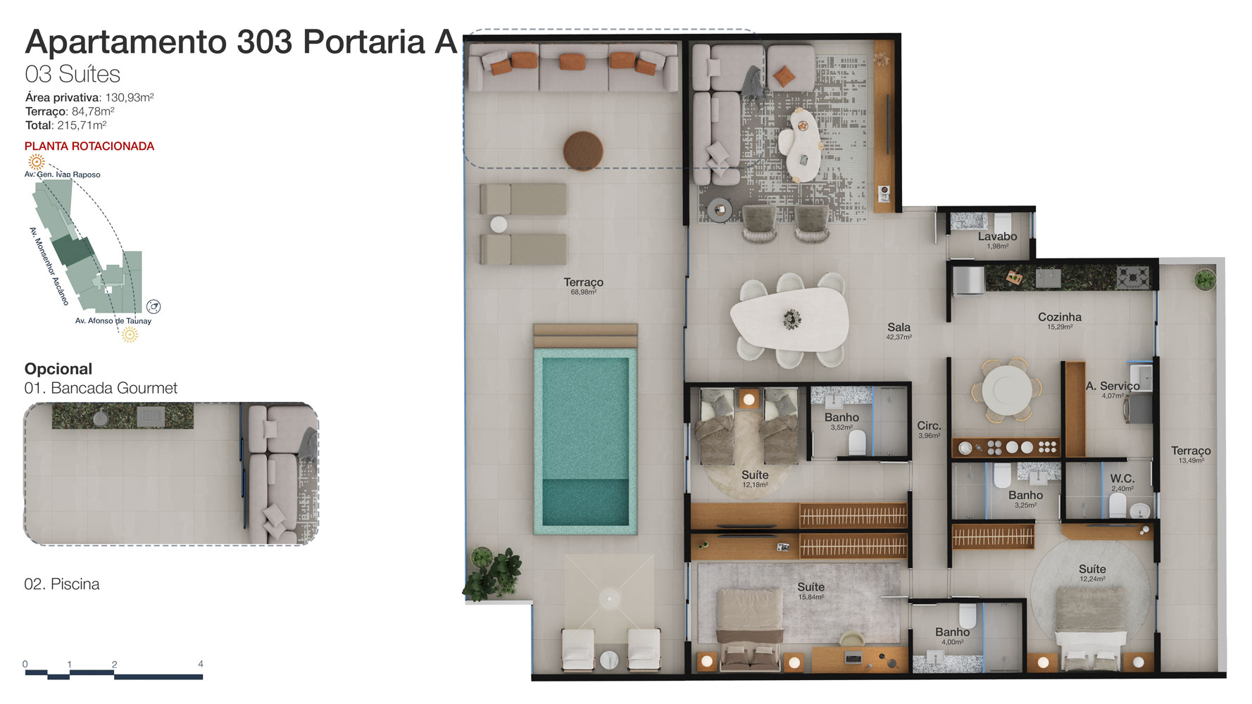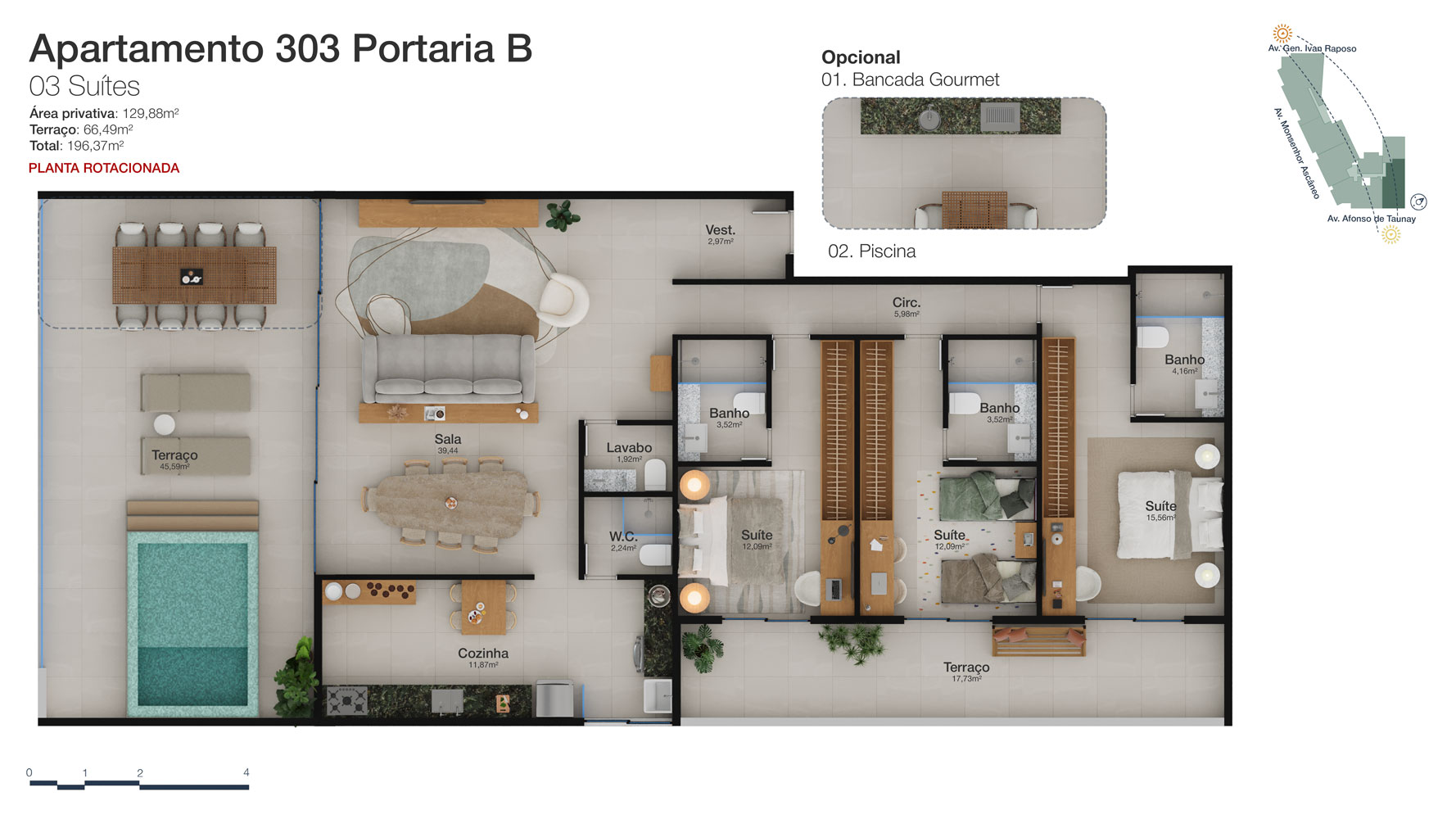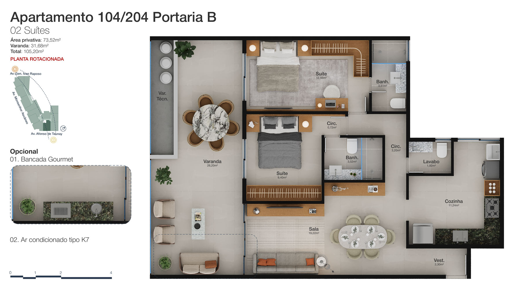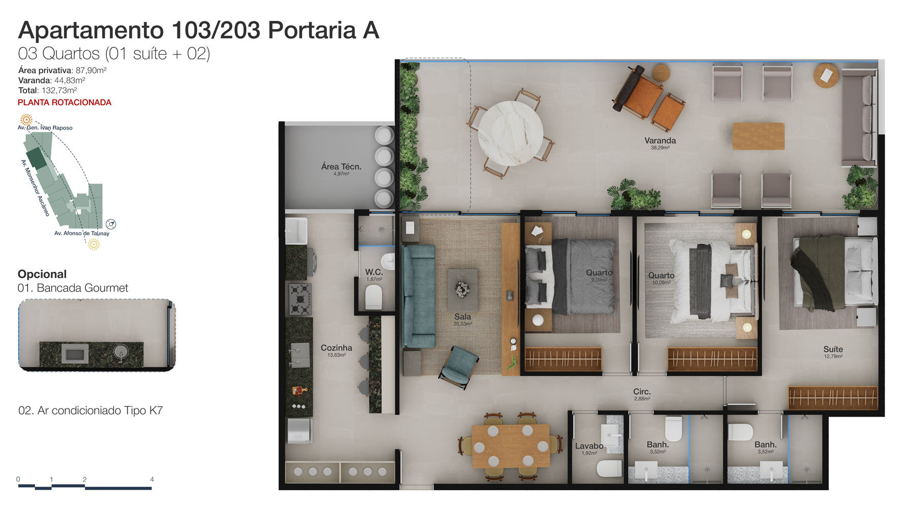 Tipologia: Apartamentos de 2 a 3 suítes e coberturas lineares de 2 e 3 suítes