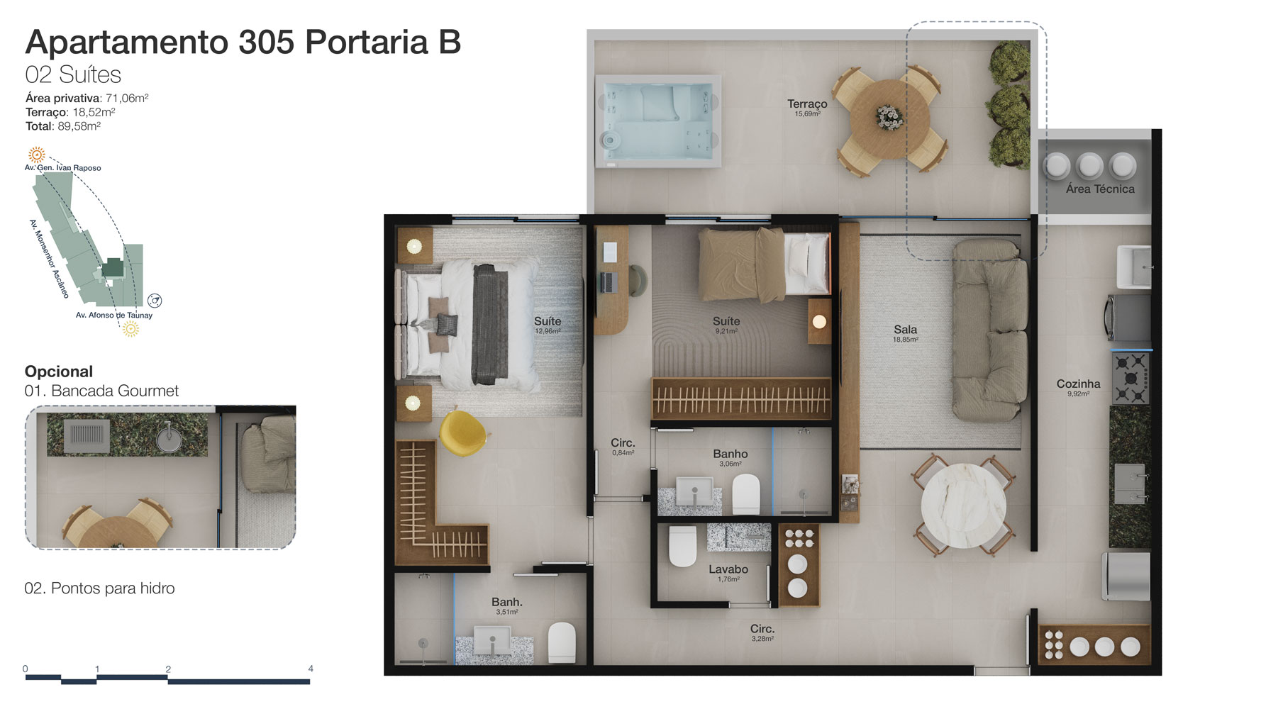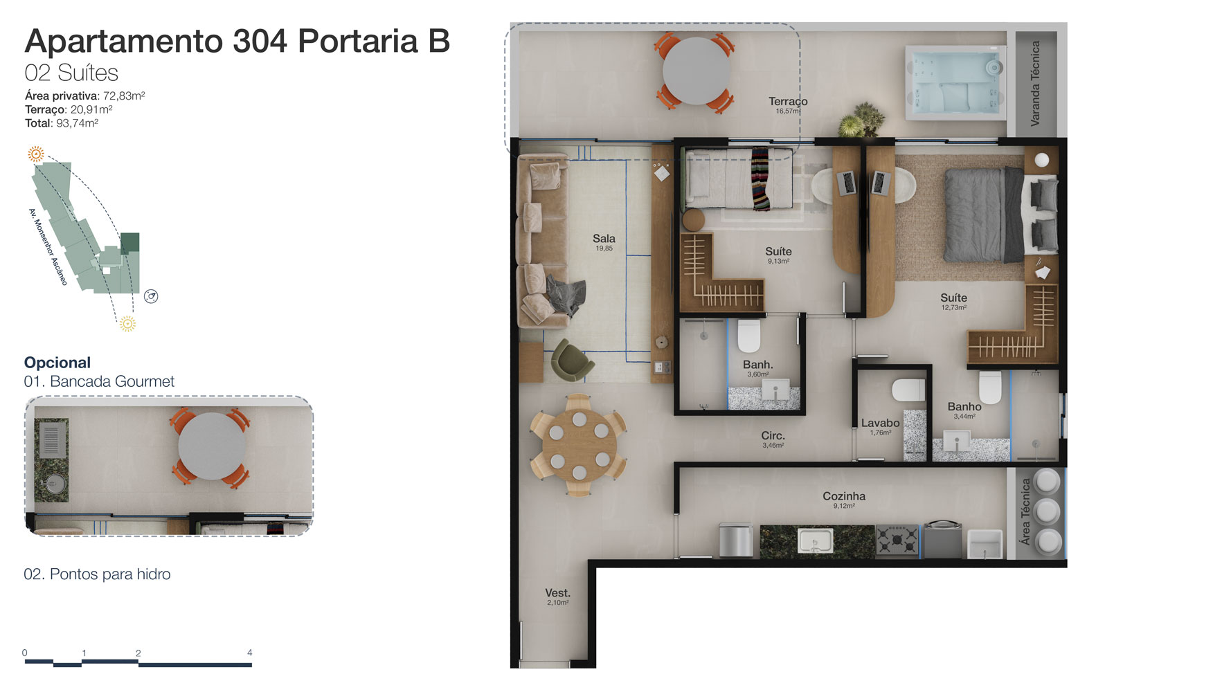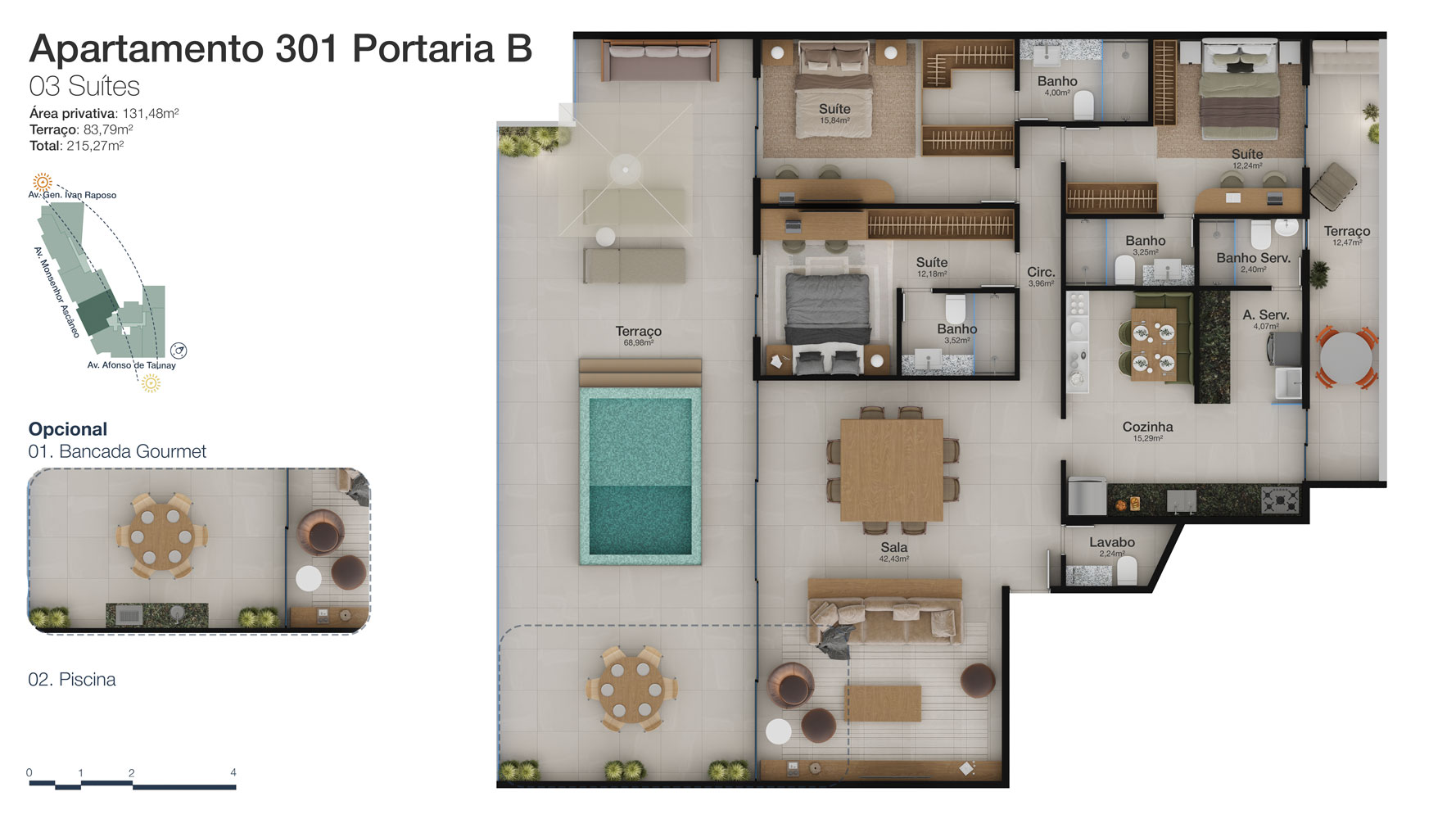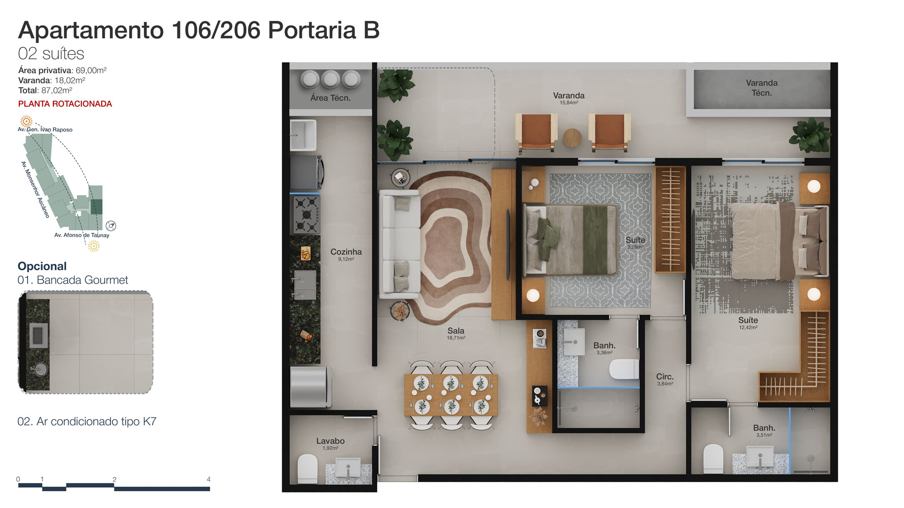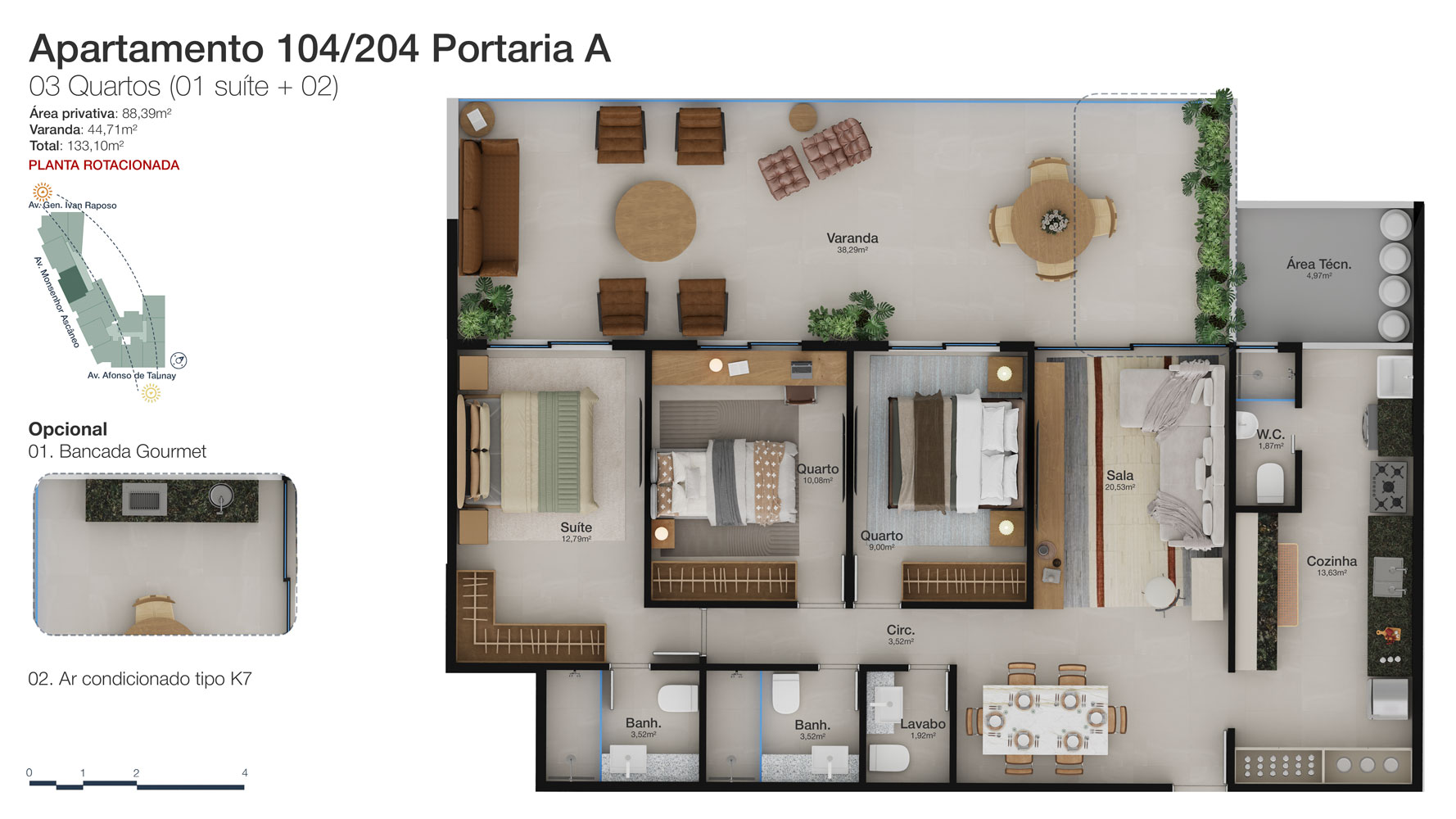 Tipologia: Apartamentos de 2 a 3 suítes e coberturas lineares de 2 e 3 suítes