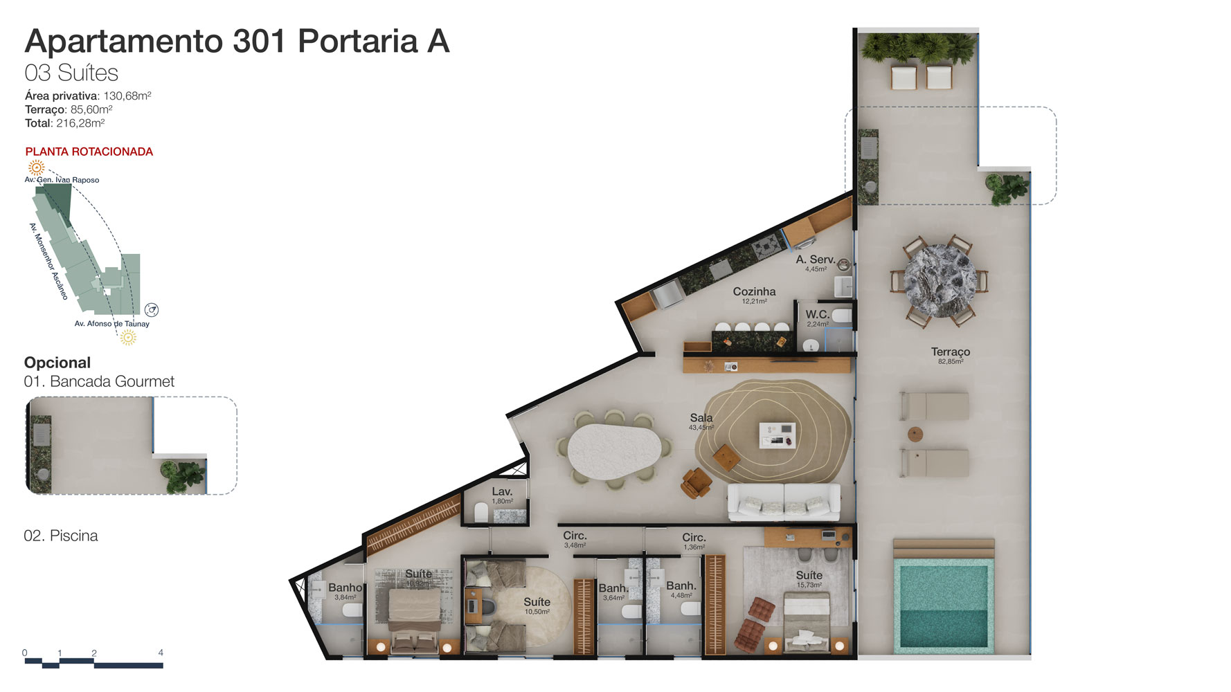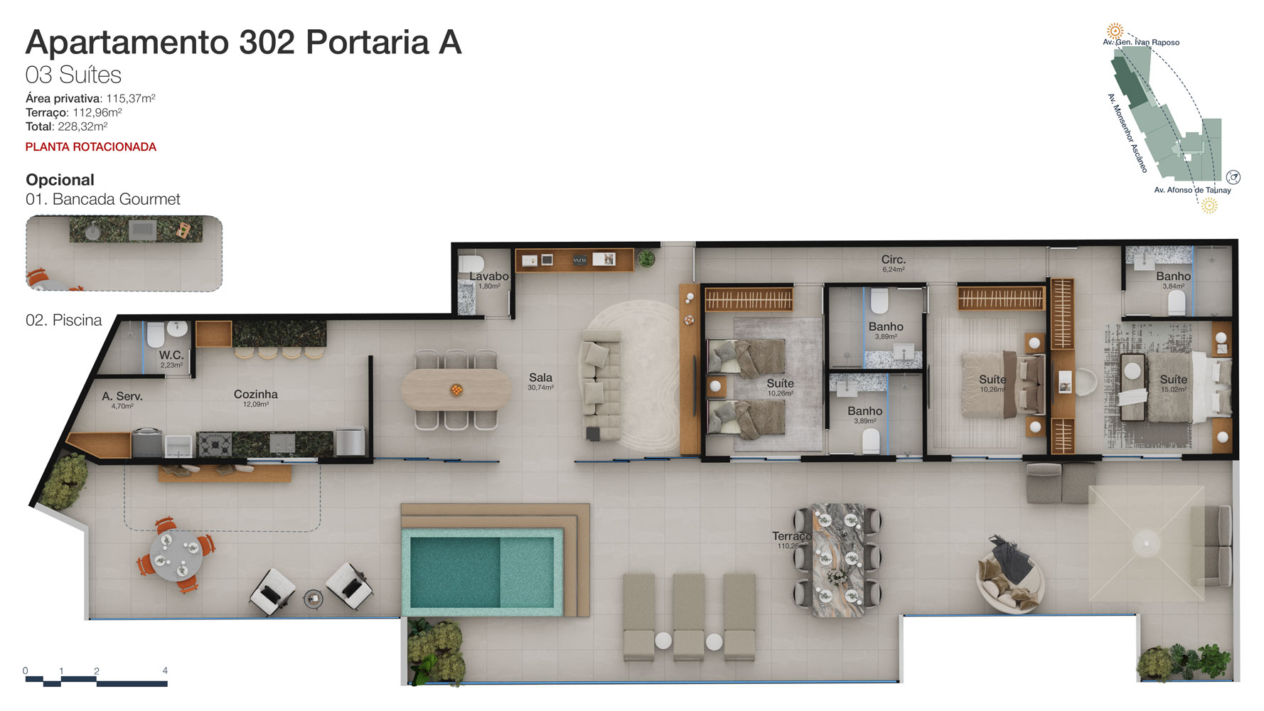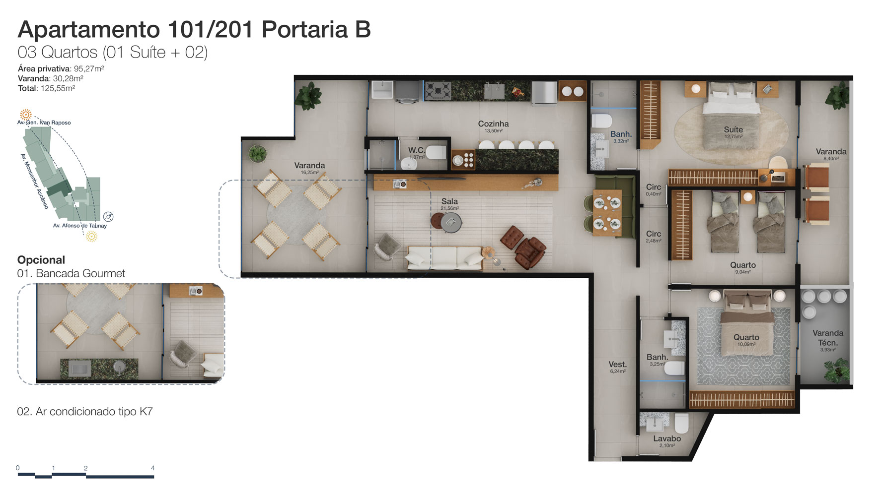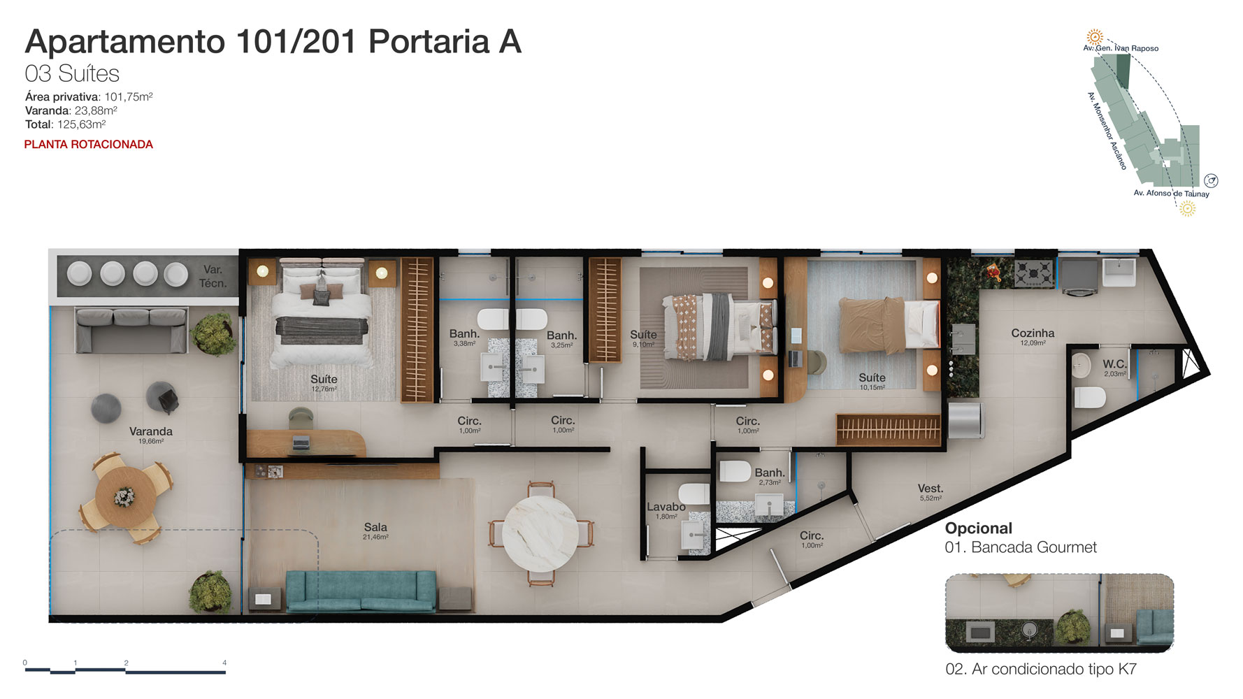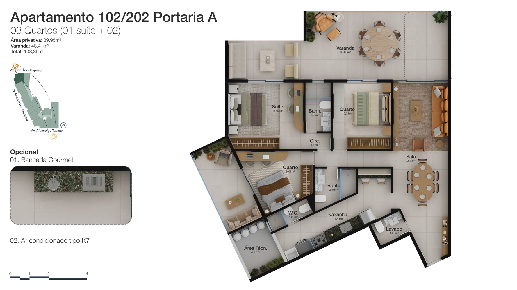 Tipologia: Apartamentos de 2 a 3 suítes e coberturas lineares de 2 e 3 suítes